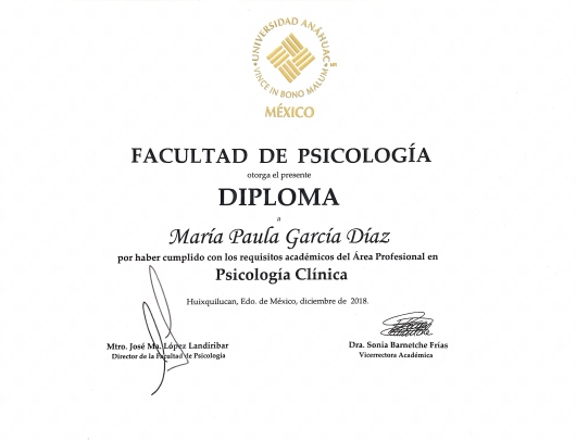 Soy una Psicóloga egresada de la Universidad Anáhuac México con especialidad en Psicología Clínica. Durante mis estudios fui reconocida con Excelencia Académica y con el Premio Ceneval al Desempeño de Excelencia Egel 2018. Cursé la Maestría en Psicoterapia Psicoanalítica en el Centro Eleia. Mi experiencia profesional abarca diversos ámbitos; incluyendo el trabajo en entornos escolares, en empresas y la práctica privada con pacientes. Durante los últimos 6 años, me he dedicado a brindar consultas privadas atendiendo a niños, adolescentes y adultos, y he tenido la oportunidad de ayudar a mis pacientes a comprender y superar los desafíos emocionales y mentales que enfrentan. Desde hace 4 años formo parte de una Clínica de Psicoterapia privada atendiendo pacientes de todas las edades, y en donde nos encontramos en constante actualización y supervisión. Estoy comprometida con ofrecer un espacio seguro y confidencial para tu crecimiento personal y emocional.